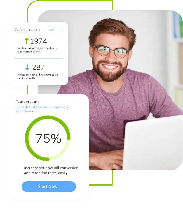 Automatically message leads via voicemail, forced calls, SMS, emails, website chat widget, FB Messenger & more